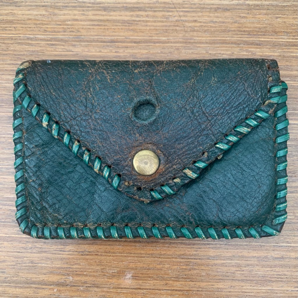 During a little poke around in their mixed basket of wallets, something caught my eye. It was a purse that was clearly a lot older than the rest of them, seemingly handmade from green leather, demonstrating a leather binding technique that I’d seen my grandparents use to make wallets and bags.